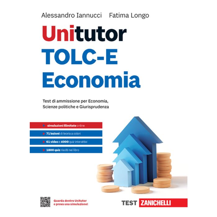 Unitutor ti aiuta a: * studiare tutta la teoria che serve per superare il test di ammissione * visualizzare i concetti fondamentali con le immagini a colori e gli esempi svolti * collegare i quiz con la teoria necessaria per risolverli * risolvere i quiz con le tracce per la soluzione * esercitare online le conoscenze e le strategie acquisite Nel libro * 71 lezioni a colori: 38 di logica, 11 di comprensione verbale, 22 di matematica * 188 esempi svolti * consigli pratici e strategie di calcolo e memorizzazione per affrontare il test * idee per risolvere quiz difficili * 1800 quiz divisi per lezione e in ordine di difficoltà, con tracce per la soluzione * 2 simulazioni commentate * 61 video da attivare anche con l?app laZ Guarda! per la realtà aumentata Nel sito online.zanichelli.it/unitutor/economia * 7 video con consigli pratici per affrontare il test, pillole di teoria e quiz risolti * 20 videoesercizi di ragionamento logico * 34 animazioni di matematica * il formulario di matematica Nel sito zte-unitutor.zanichelli.it * il simulatore per creare un numero illimitato di simulazioni, anche personalizzate, con punteggio e cronometro. Il tempo disponibile per ogni materia è quello previsto dal TOLC. * 4000 quiz per l?allenamento in logica, comprensione verbale e matematica, divisi per argomento, con feedback «Hai sbagliato, perché...». Puoi rispondere anche con lo smartphone. Nell?ebook online e offline trovi tutte le pagine del libro da sfogliare, i link aiquiz interattivi e ai video. In sintesi: * Simulazioni illimitate online * 71 lezioni di teoria a colori * 61 video e 4000 quiz interattivi * 1800 quiz risolti nel libro