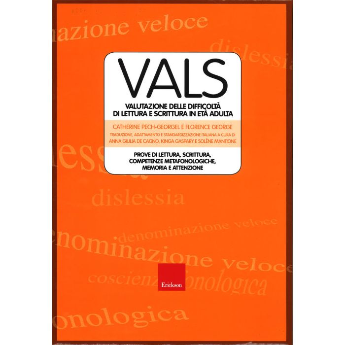 Il vals, adattamento italiano della batteria francese Evalad, nasce dall'esigenza di strumenti valutativi in grado di rilevare la presenza di Disturbi Specifici dell'Apprendimento nell'età adulta (range 18-70 anni) con l'obiettivo di definire il profilo del soggetto e le eventuali misure compensative e dispensative, per favorirne il successo scolastico, accademico e lavorativo. A questo scopo, la batteria non indaga unicamente le competenze di lettura e scrittura, ma permette di effettuare una valutazione estesa a tutte le aree cognitive legate ai processi di apprendimento del codice scritto. Il vals si compone di 14 prove suddivise in 5 aree: linguistica: coscienza fonologica, denominazione rapida automatizzata; lettura: lettura di parole e non-parole, lettura del testo; scrittura: dettato di parole e non-parole, dettato di brano; attenzione: attenzione visiva e uditiva; memoria: memoria verbale immediata e differita, span numeri diretto e inverso, listening span. Per ciascuna prova vengono forniti i dati normativi di riferimento e le proprietà psicometriche, nonché le modalità di somministrazione, calcolo e interpretazione del punteggio. Contiene le prove: lettura di parole e non-parole; coscienza fonologica: prova di segmentazione e fusione fonemica; memoria verbale: richiamo immediato di parole; denominazione rapida automatizzata; memoria verbale: richiamo differito di parole; lettura del testo; attenzione visiva; dettato di parole e non-parole; attenzione uditiva; comprensione del testo in soppressione articolatoria; span numeri diretto; span numeri inverso; listening span; dettato di brano.
